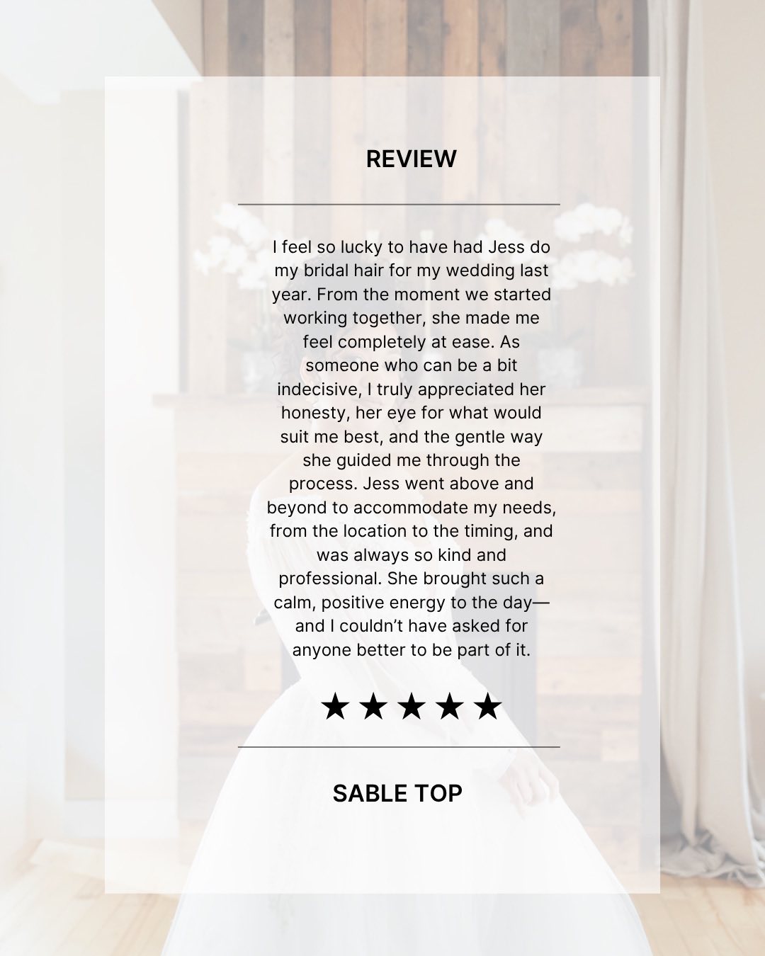 I feel so lucky to have had Jess do my bridal hair for my wedding last year. From the moment we started working together, she made me feel completely at ease. As someone who can be a bit indecisive, I truly appreciated her honesty, her eye for what would suit me best, and the gentle way she guided me through the process. Jess went above and beyond to accommodate my needs, from the location to the timing, and was always so kind and professional. She brought such a calm, positive energy to the day and I couldn’t have asked for anyone better to be part of it.